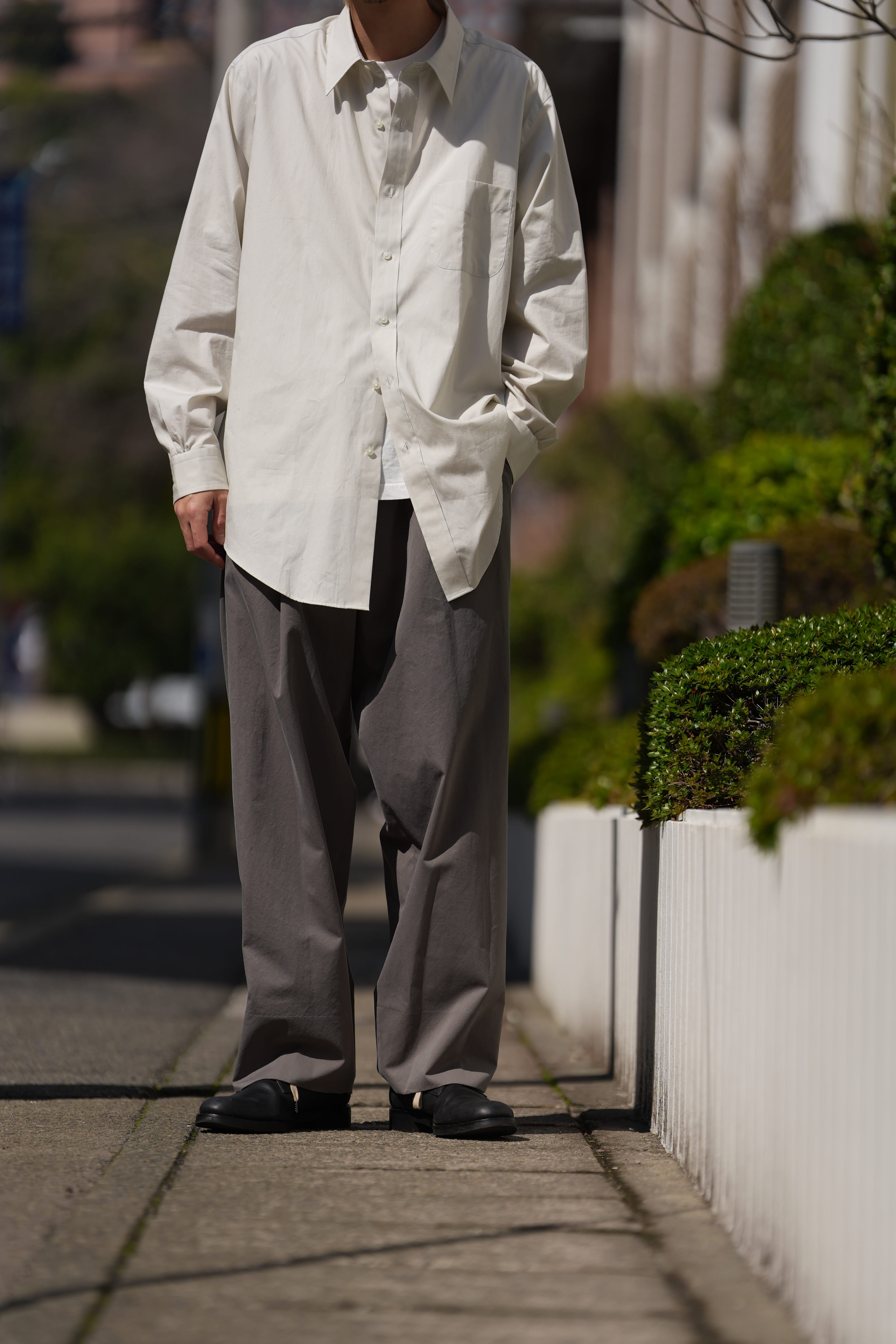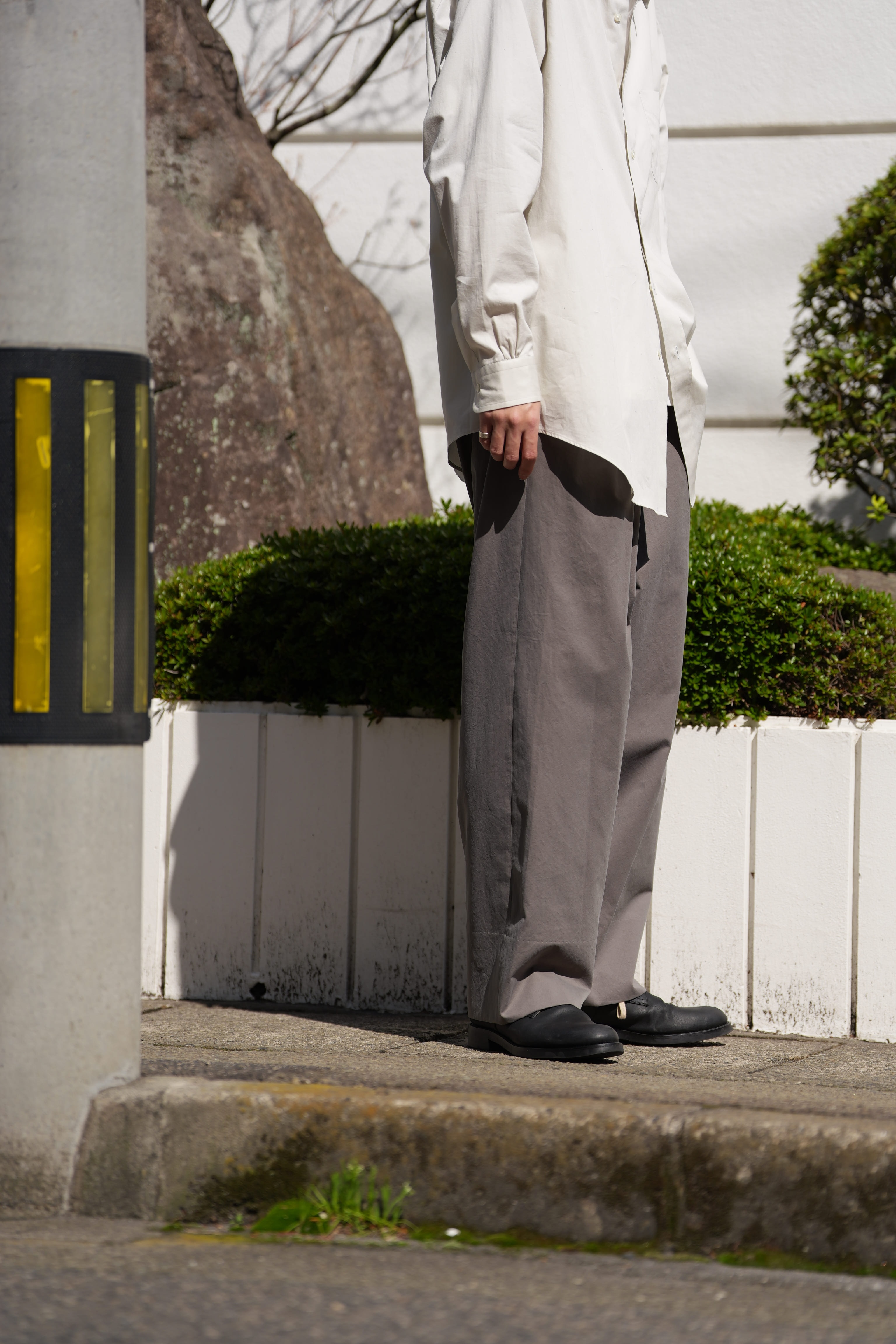 シャツ:FOUNDOUR (ファウンダ) 26SS “COTTON BROAD REGULAR COLLAR SHIRT” -LIGHT GREY- ¥29,700-(intax) 着用サイズ2