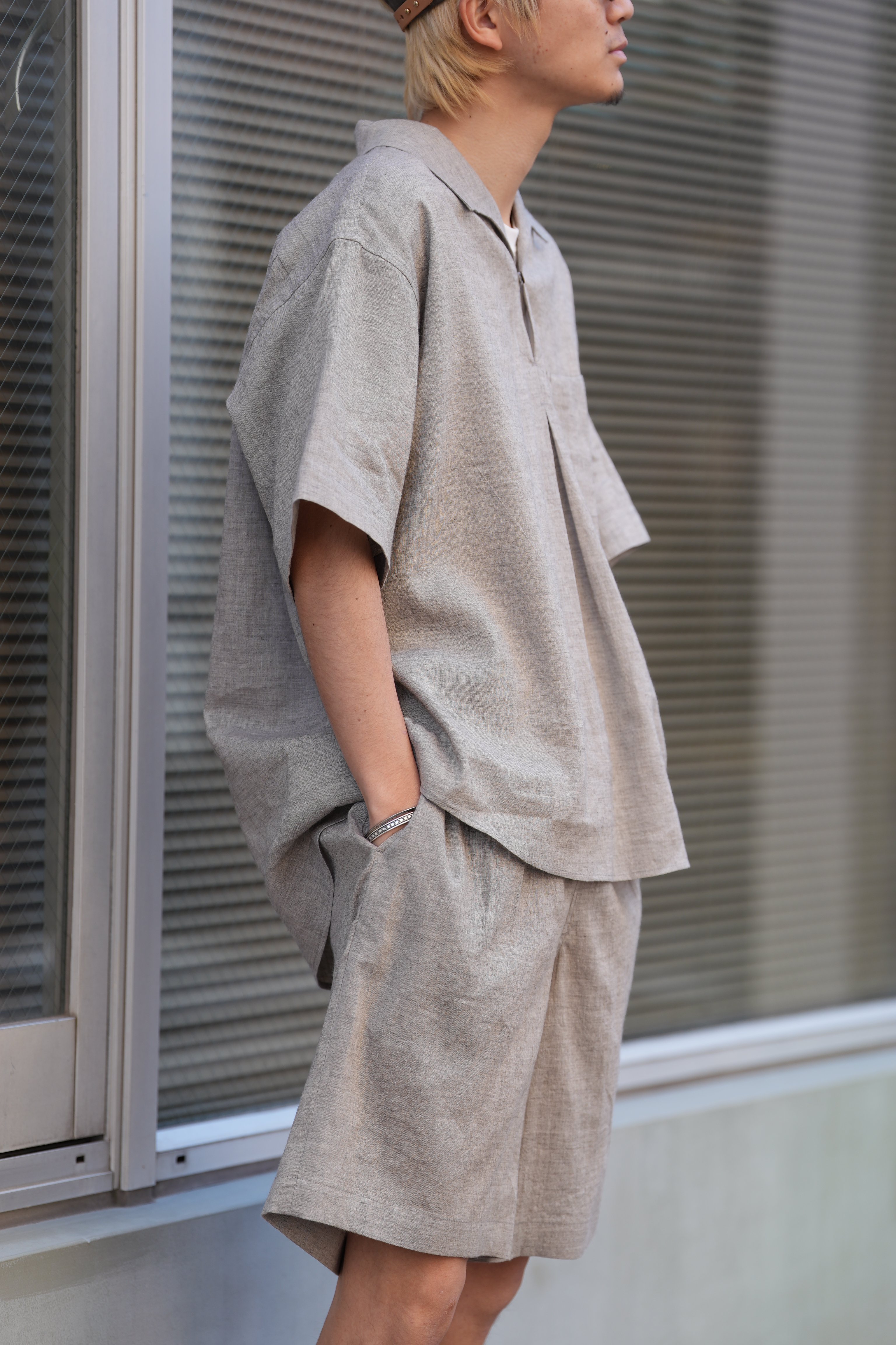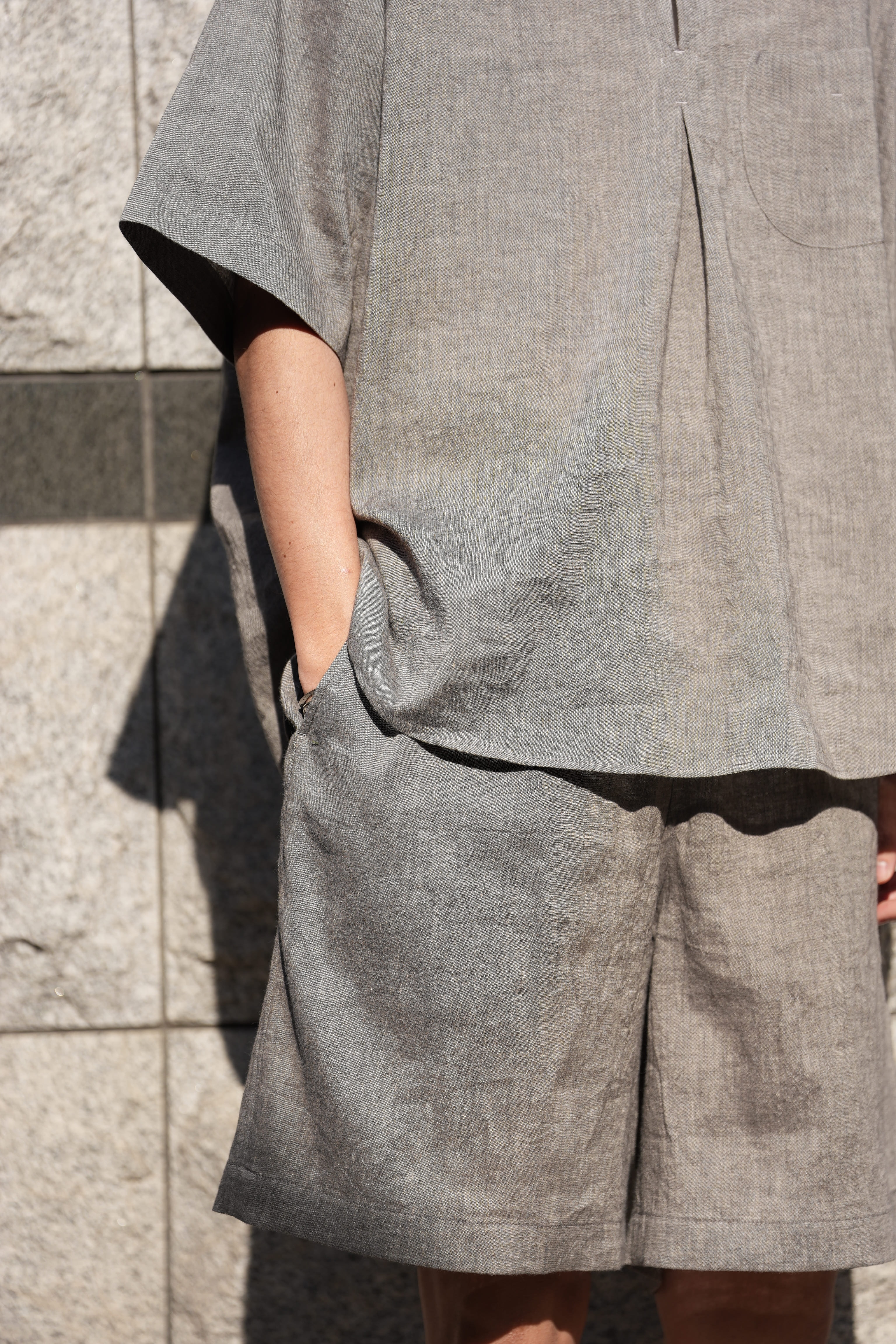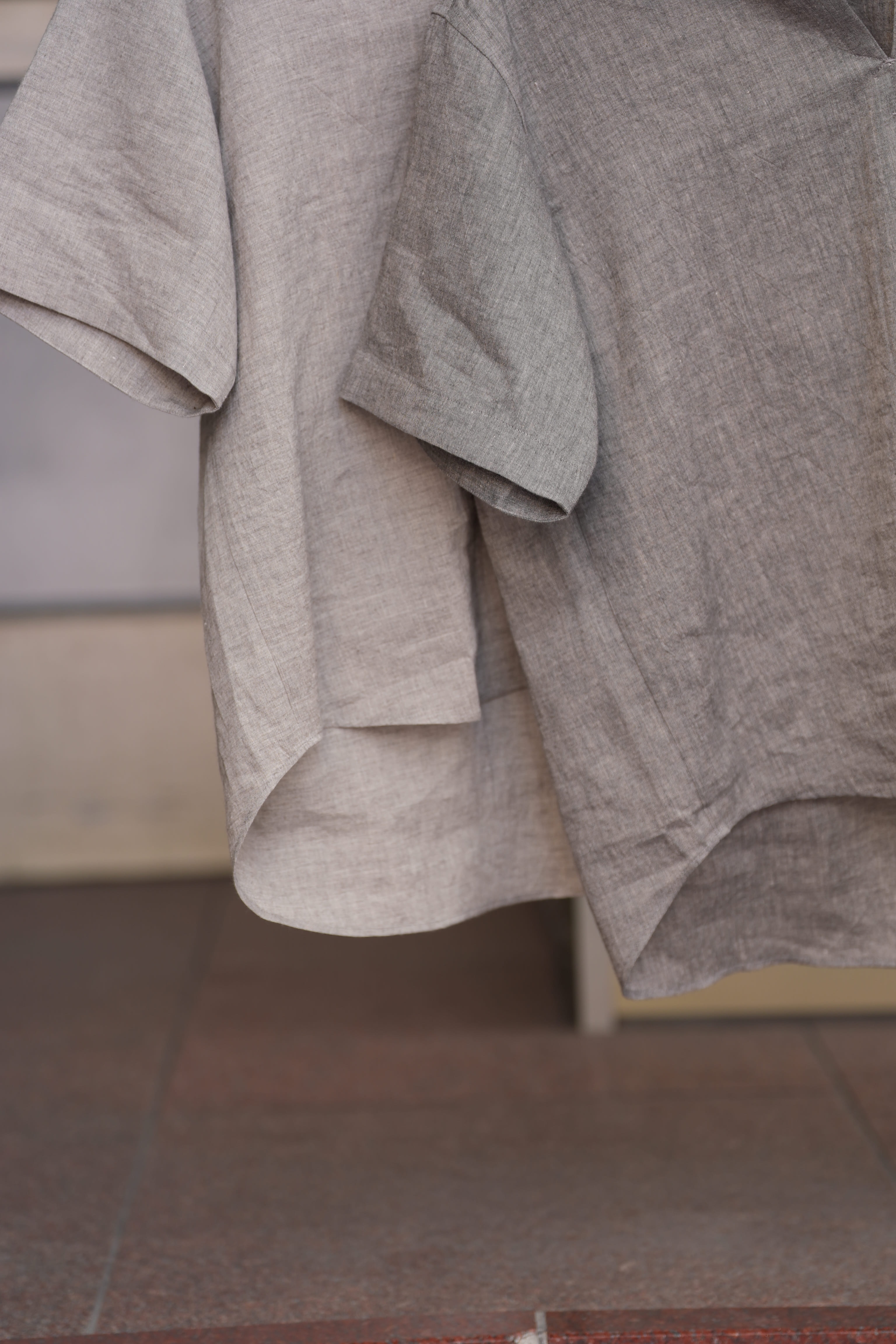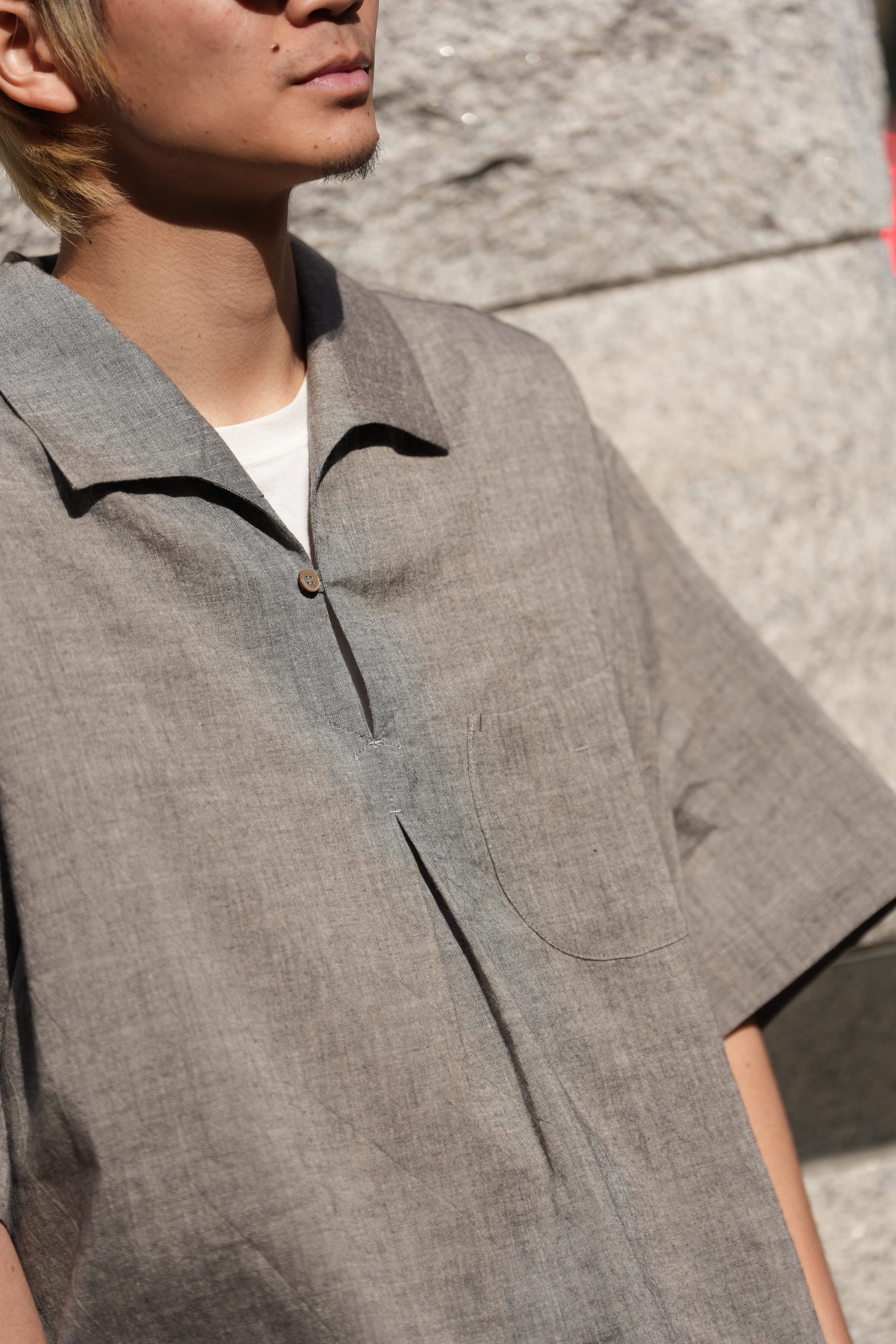 生地のメインにはリネン、コットンを使用していて、触った感じもリネン、コットンの感触が大半を占めているように感じますが、実際に着てみると違います。ヤク特有のヌメりと弾力性を感じる事が出来ます。リネンが半分以上を占める混率なので通気性は良い、コットンによってコシがあり強度も増している、そこにヤクが入る事で肌触りを劇的に変えてくる。