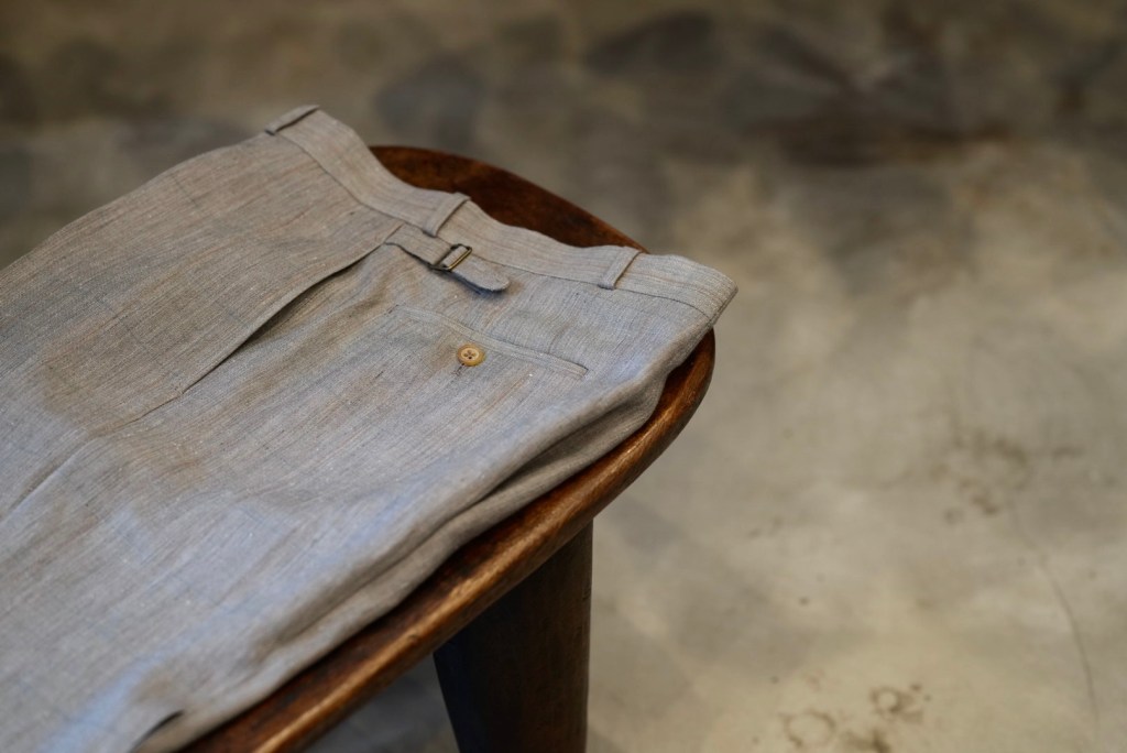 完全な夏にまずは生地メインとなるのはリネン、ウール。多くの生地ではリネンを緯糸、ウールを経糸に使用しますが、経糸にリネンを使用する事で見え方の硬さをなくしました。リネンの混率が半分以上を占めていますが、落ち感のあるリネンウールを実現しました。