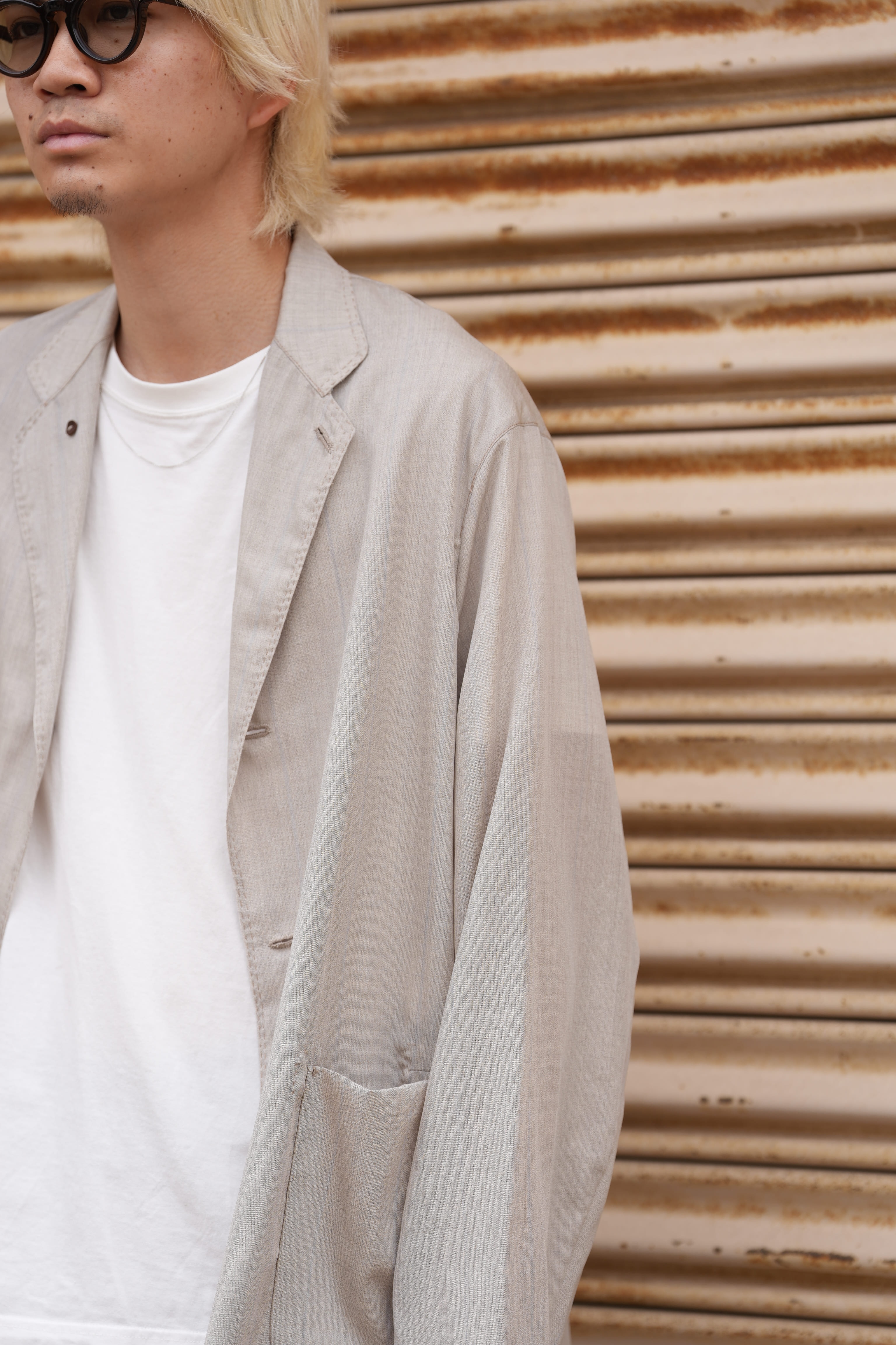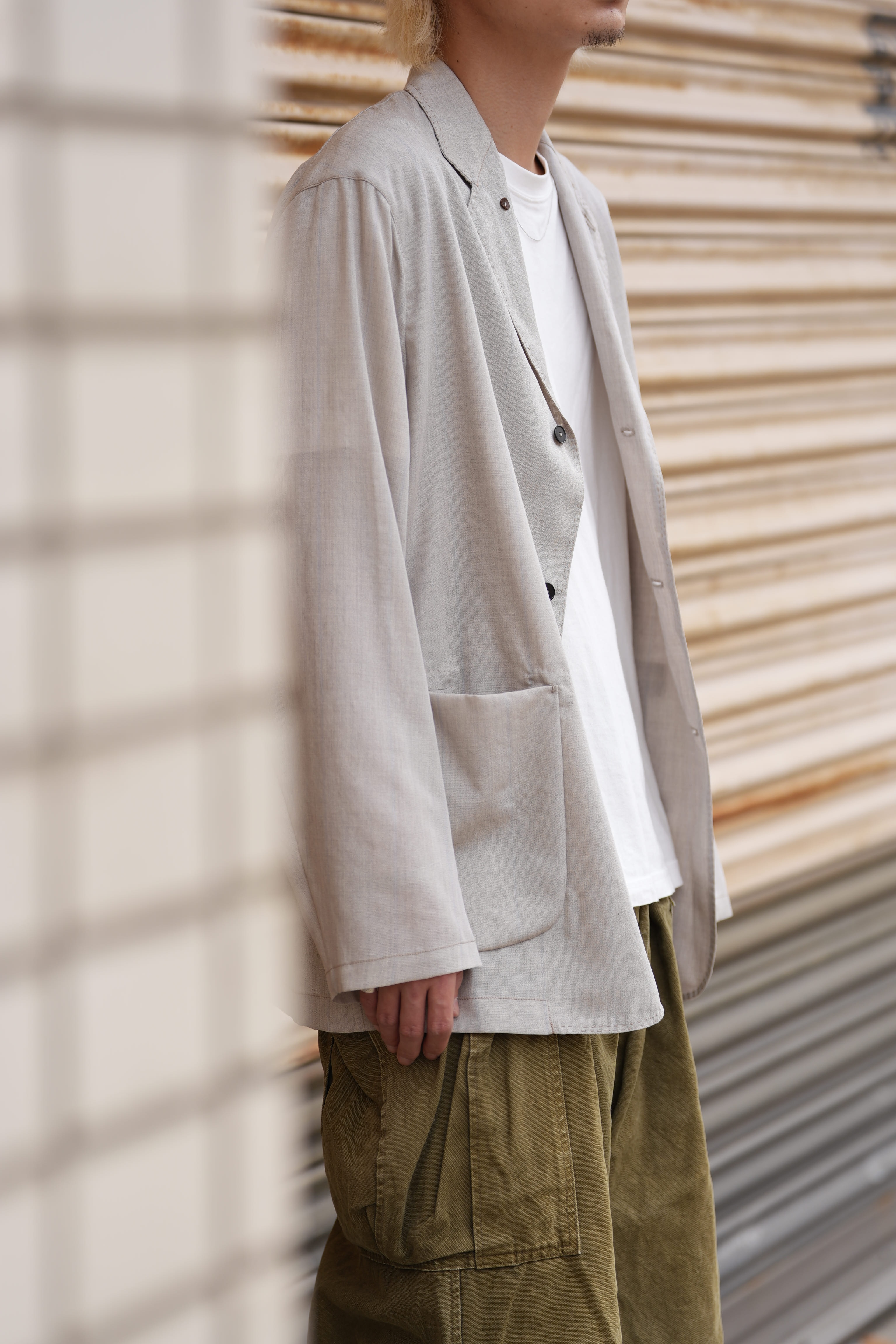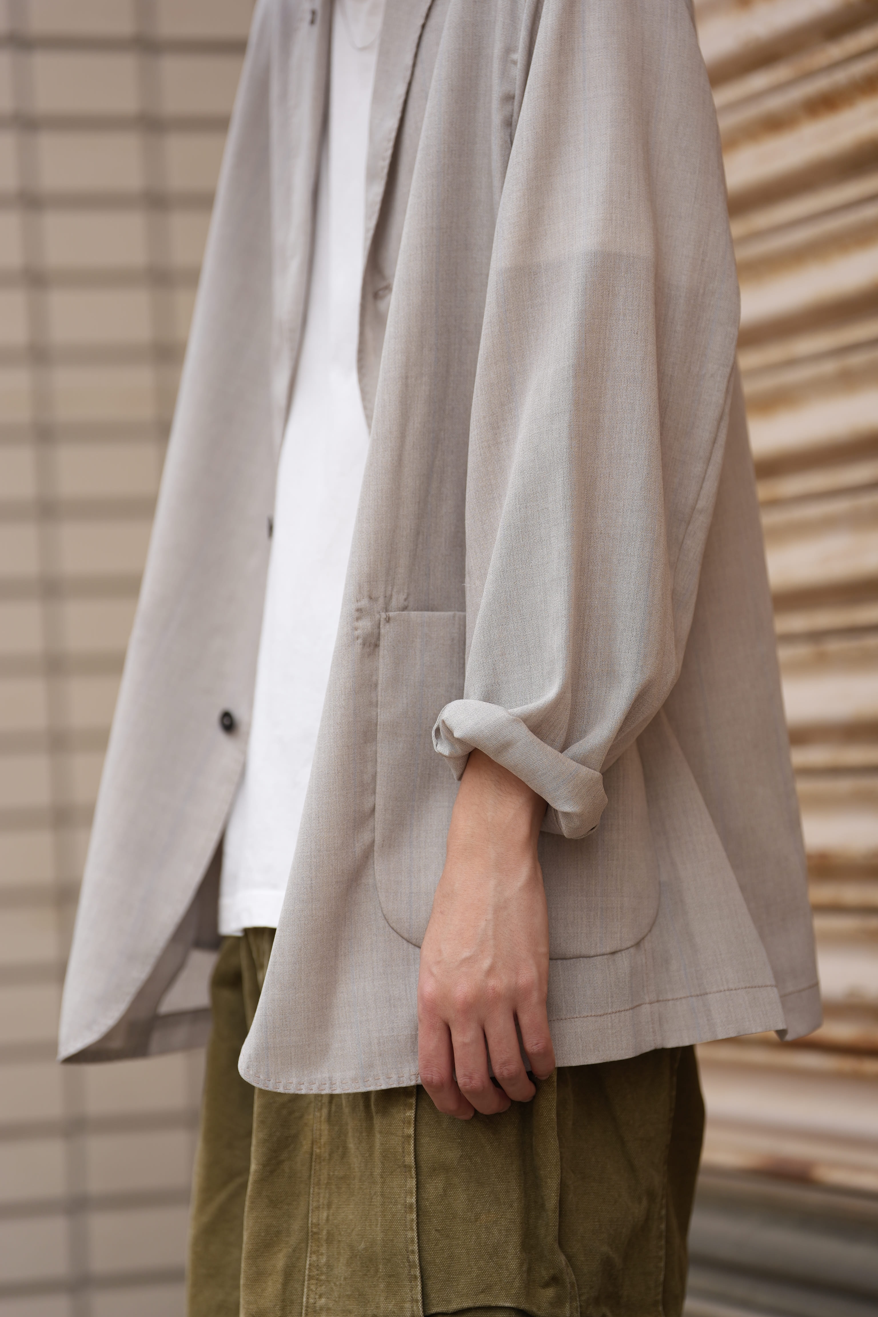 夏ドSリネンに救われた方なら分かっているはず、半袖よりも涼しい長袖は存在すると。袖があるとかは関係ない、生地の面積は関係ない、ジャケットを身に纏っている感覚はある、しかし、生地を纏っているとは思えない程の通気性と裸よりも心地の良い、夏を快適に生きるためのドライな肌あたりを生み出しのが俺のサマーウールです。