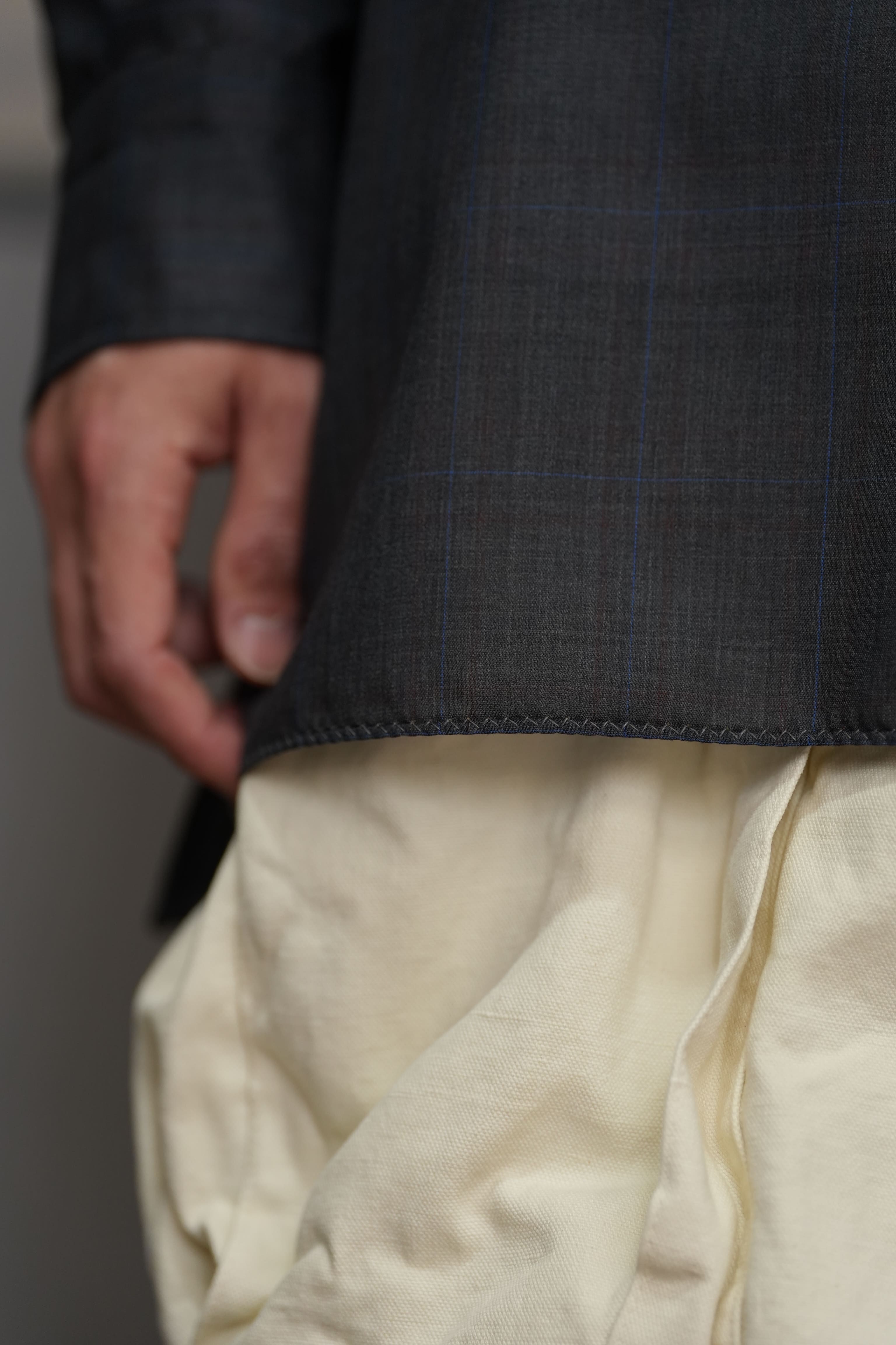 僕が惹かれたのは型だけではない、このさりげないチェックが良いじゃないですか、チャコールベースにブルーのライン。モノトーンに合わせても良いし、デニムやカーゴのカジュアルなスタイリングにも落とし込みやすい。