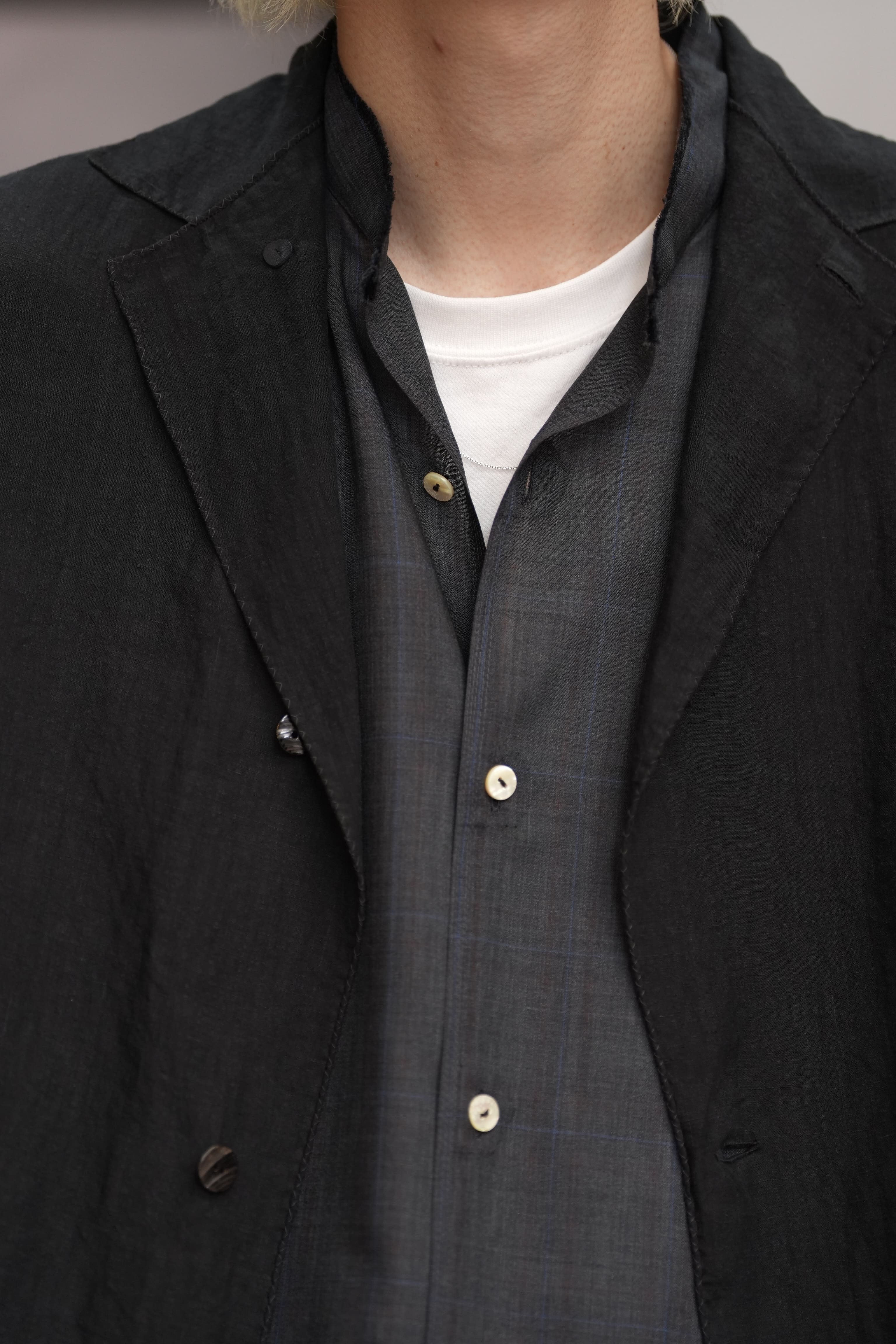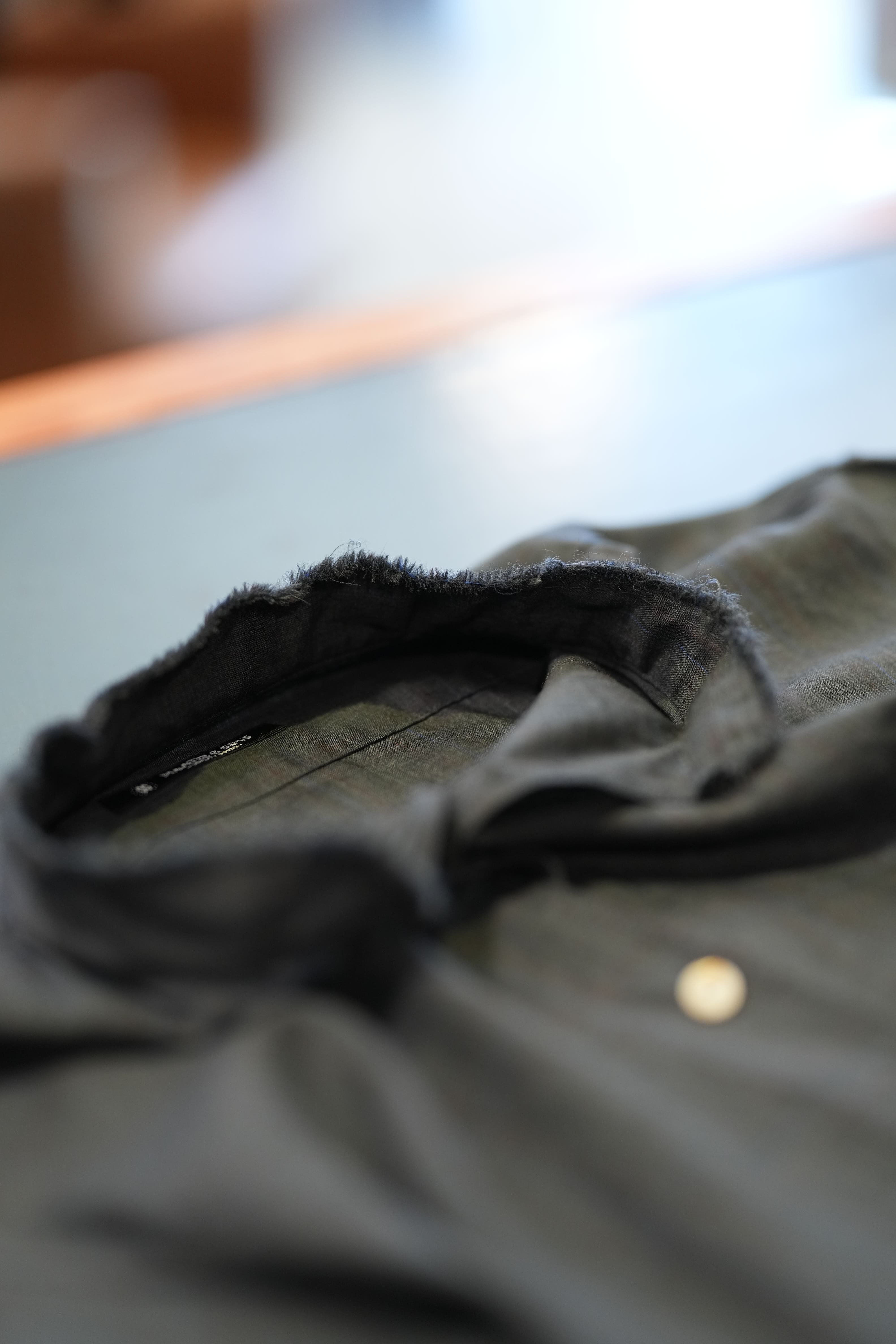 あれはとても気に入って着ていて、夏終盤に思った事がありました、このシャツは鬼ヘンプである事も大事だけどこの型が良いのではないか?襟は切りっぱのワシャワシャ仕様。第1ボタンを外した時のVゾーンがとても良い。夏のスタイリングを形成する上でこのVゾーンの深さから清涼感を出せると言うのは素晴らしい。ここの塩梅は一歩間違えるとファッションではなくなるのでご注意下さい。